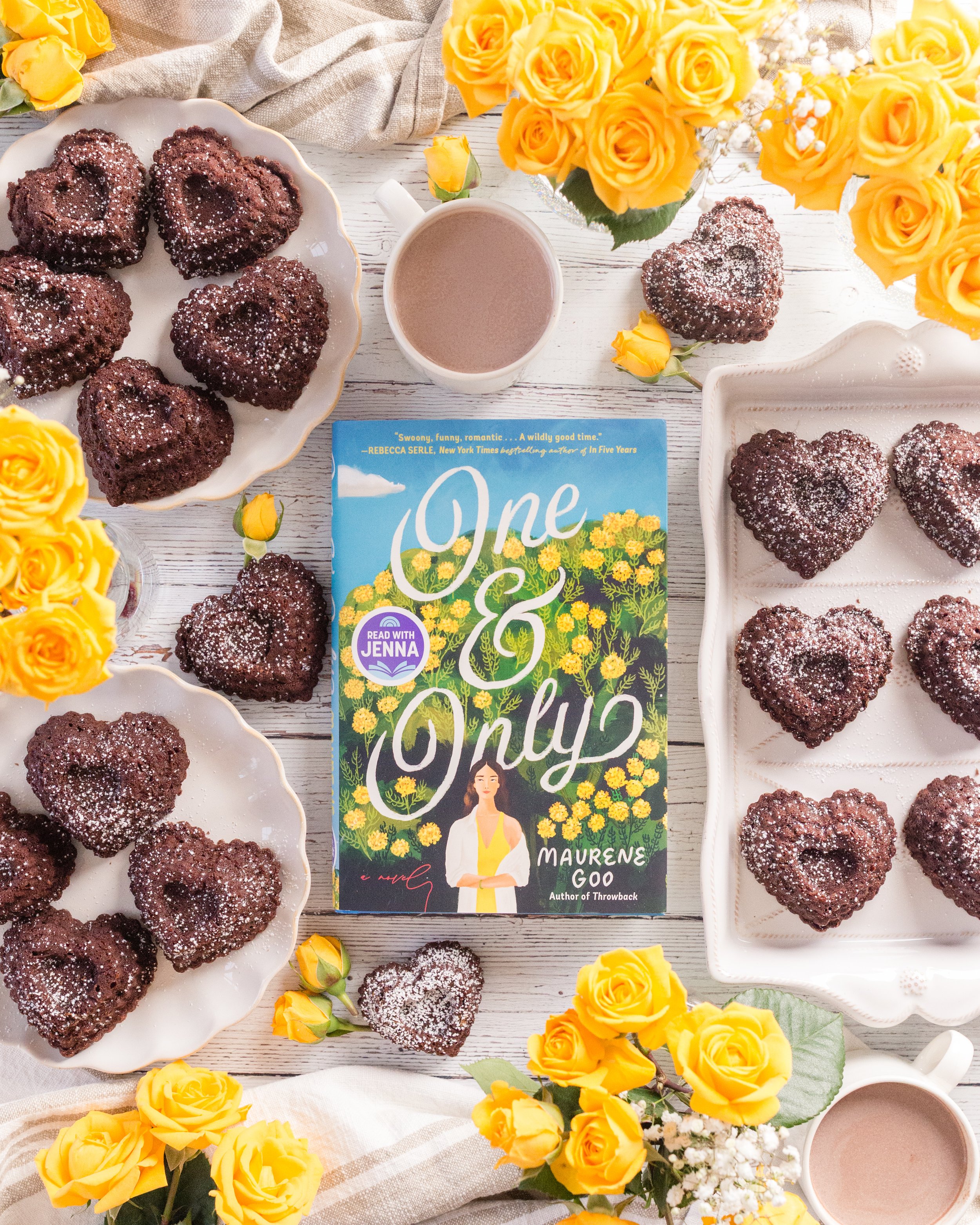 For this book I wanted a pairing that was valentines-y, romantic, and yellow! Cassia is named for a yellow flowering plant in her late mom’s garden, and the little plot points around the cassia flowers come full circle in such a lovely way. And that cover! These mini chocolate valentine cakes were made with my @nordicwareusa heart molds - not an ad, I just love everything Nordic Ware does.